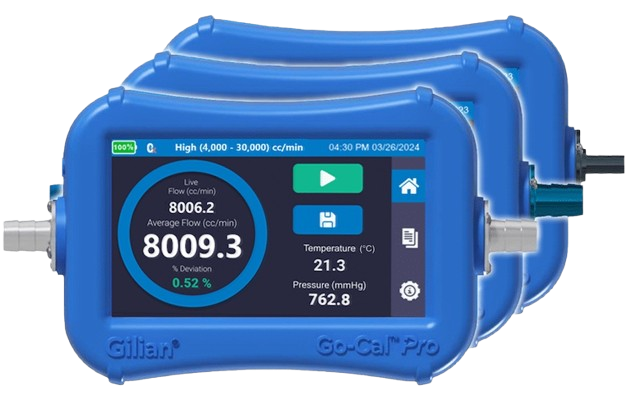 Utilizamos calibradores de fluxo de última geração e que são calibradores de vazão primária, para calibrar bombas ou qualquer outro instrumento de amostragem de ar, que desenha uma amostra de ar ativa. O Modelo Go Cal Pro, que possuem gama de ≥0,005 a 0,600 e ≥0,600 5,0 L/min (Low Flow e STD Flow), além de, compensação de temperatura e pressão corrigida para calcular a taxa de fluxo volumétrico em uma precisão de 1% da leitura.